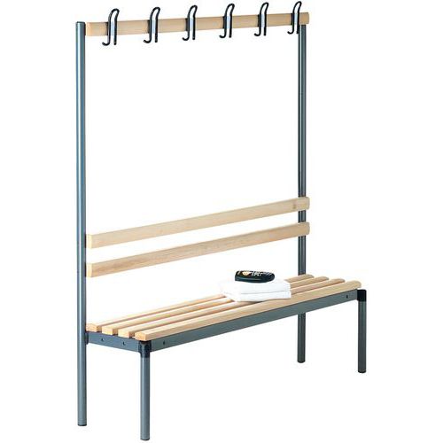 - Yksipuoleinen penkki epoksimaalatulla teräsrungolla. Istuin, selkänoja ja profiili kevyesti pyöristettyä pyökkilamellia Muovista valmistetut, sisään päin suunnatut vaatekoukut (DIN-std). Korkeutta säädetään säätöruuvien avulla.