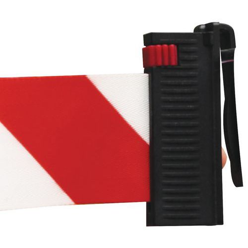 Ulosvedettävä nauha seinään asennettavalla kiinnikkeellä. Kasetti kääntyy 180°. Kiinnittimet mukana. Erinomainen tuote rajaukseen.