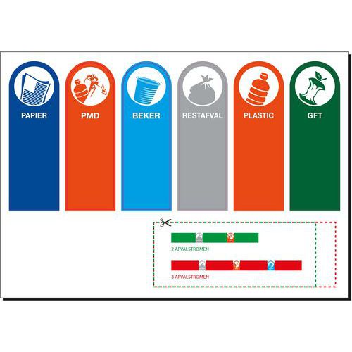 Mukana on hollantilaisia kierrätystarroja, jotka tekevät eri jätevirroista selkeitä.