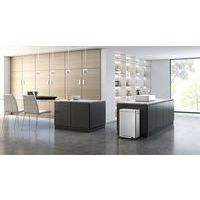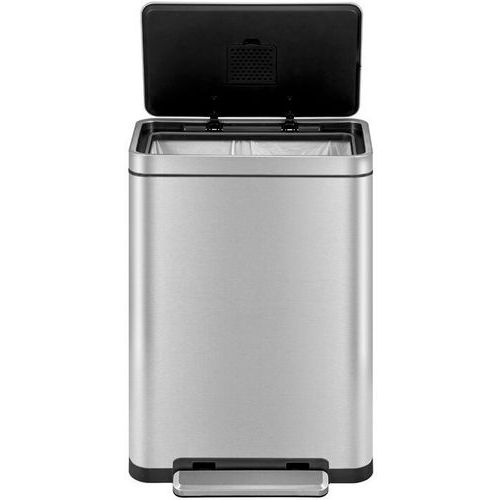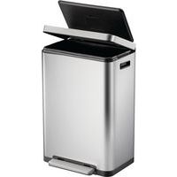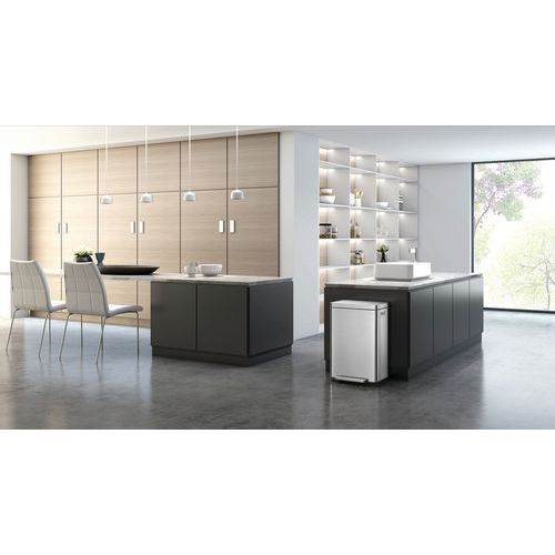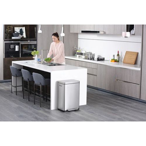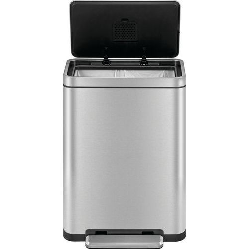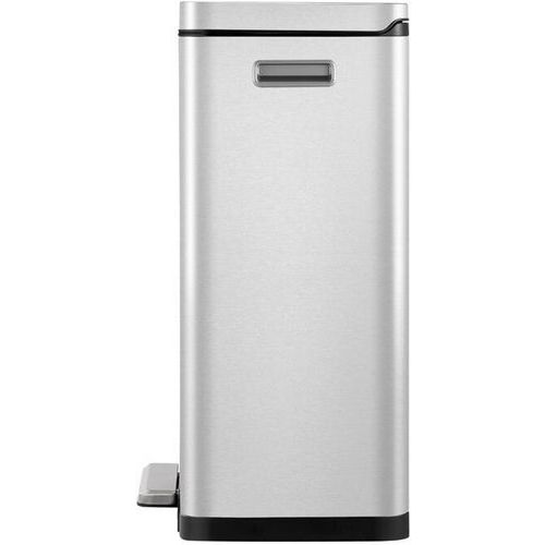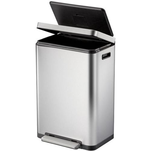 Tyylikäs suorakulmainen roskakori, varustettu erittäin leveällä polkimella, synteettisellä linerilla, hiljaisesti sulkeutuvalla kannella ja stay-open -toiminnolla.