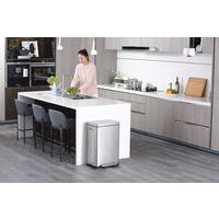 Tyylikäs suorakaiteen muotoinen poljinsäiliö, jossa erittäin leveä poljin, muovinen sisäsäiliö, pehmeästi sulkeutuva kansi ja auki pysyminen.