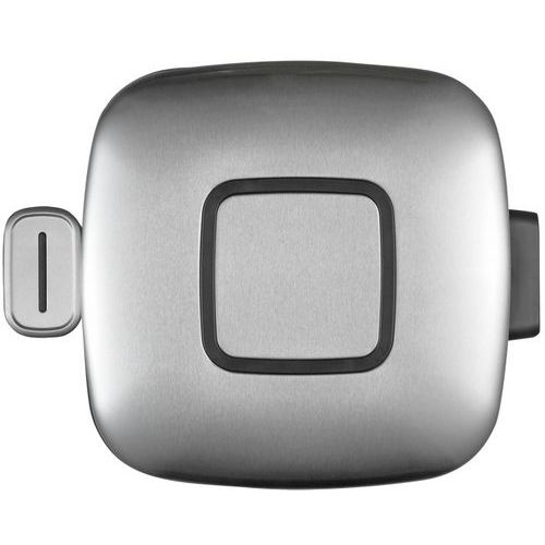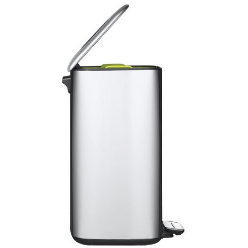 Neliön muotoinen polkimella varustettu roskakori, valmistettu harjatusta ruostumattomasta teräksestä, jossa on sormenjälkiä estävä pinta.