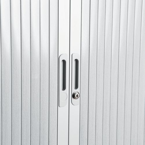 Korkea metallinen rulokaappi, kestävästä muovista valmistettu rulo ovi magneettilukituksella.