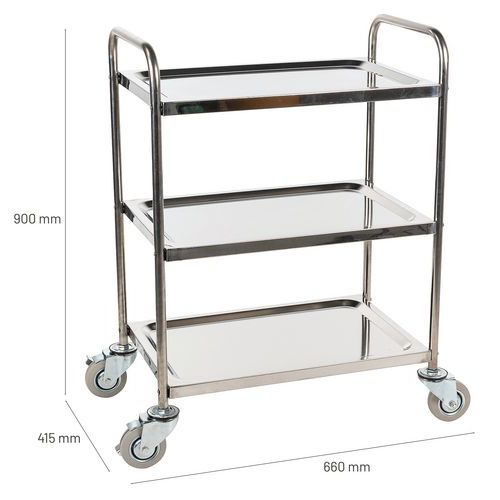 | Tavaranimike | Ruostumaton teräsvaunu, 3 tasoa, Kapasiteetti: 100 kg, Kokonaiskorkeus: 900 mm, Kokonaisleveys: 415 mm |