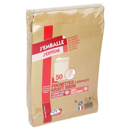 Ruskea 3 cm laskoksellinen kraftpaperikuori kirjojen, luetteloiden ja paksujen asiakirjojen lähettämiseen. Valmistettu 120 g:n vahvasta kraftpaperista. Itsekiinnittyvä suljin suojaliuskalla nopeaan ja varmaan sulkemiseen. Pakkaus sisältää 50 kuorta. Voimapaperi on puhkaisemisen ja repeytymisen kestävä. Nopea ja helppo sulkea suojanauhalla varustetun liimapinnan ansiosta.