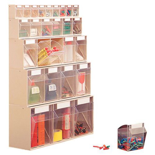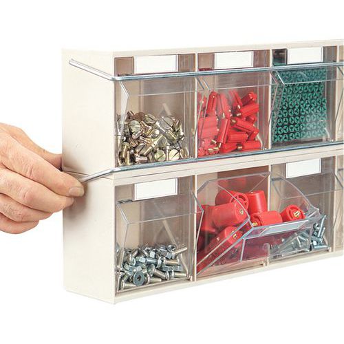 - Laatikot ovat kippattavia päätystopparilla, mikä mahdollistaa laatikon jättämisen avoimeen asentoon ja sen helpon poistamisen.