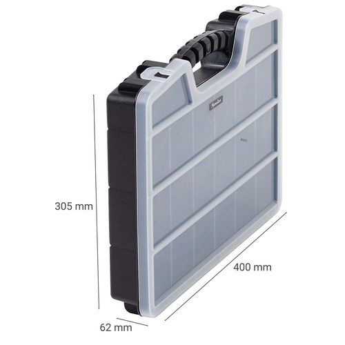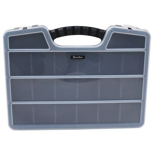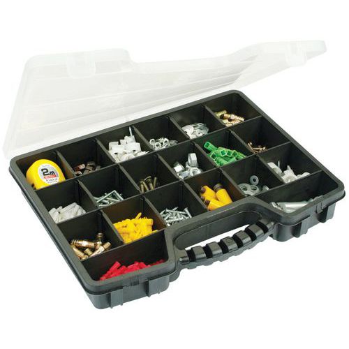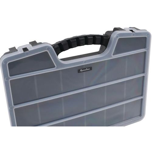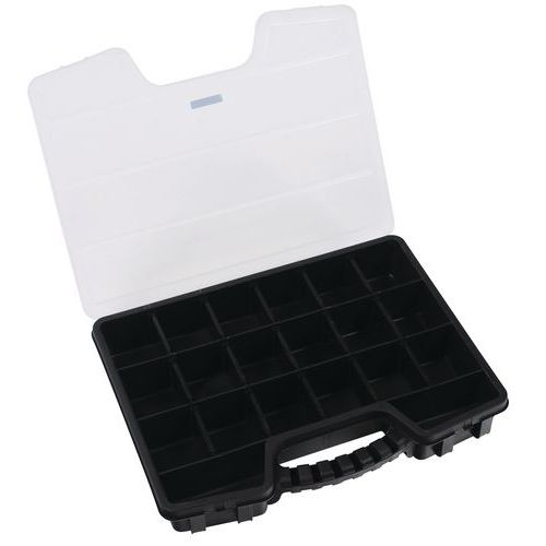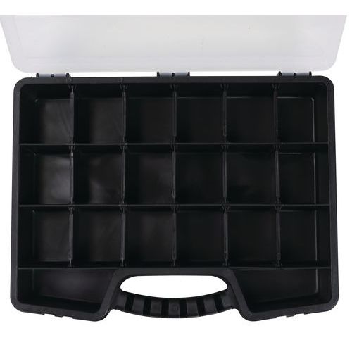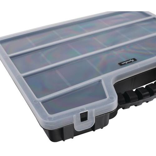 Säilytyslaatikko, jossa on 9 tai 15 kiinteää lokeroa. Läpinäkyvä kansi helpottaa sisällön nopeaa tunnistamista. Valmistettu polypropeenista, musta laatikko ja kirkas kansi.