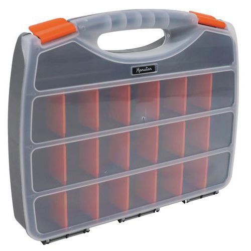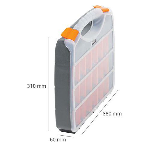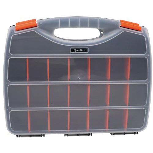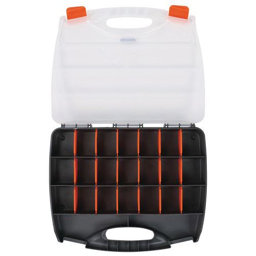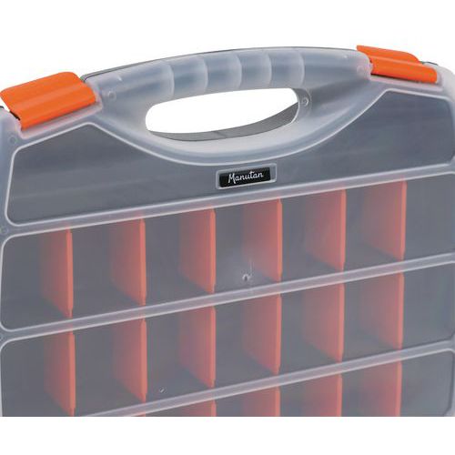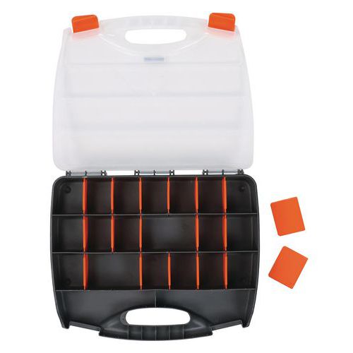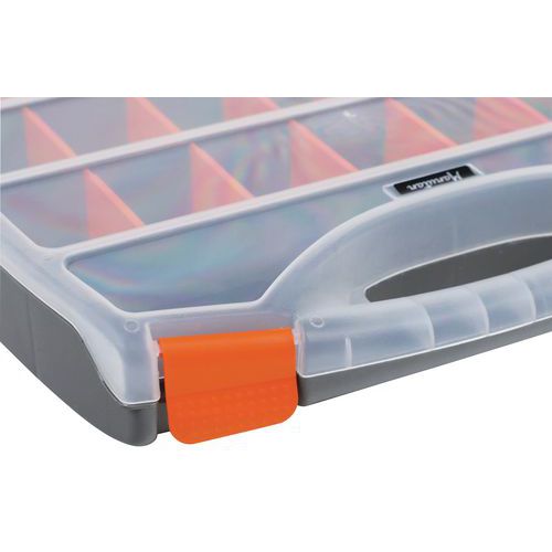 Lokerolaukku 18 jakajin. Lokeron voi jakaa pieneen osastoon siirrettävien jakajien avulla. Helppo kuljettaa. Sisältö on helppo nähdä läpinäkyvien lokeroiden ansiosta. 2 lukkokoukkua kädensijan tasolla.