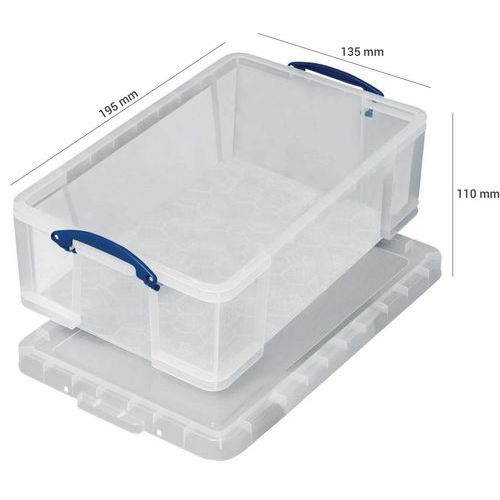 | Tavaranimike | Säilytyslaatiko, läpinäkyvä Really Useful Box, Tilavuus: 1.6 L, Kokonaiskorkeus: 110 mm |