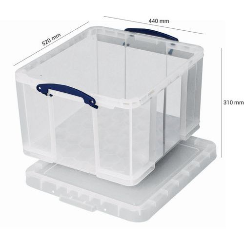 | Tavaranimike | Säilytyslaatiko, läpinäkyvä Really Useful Box, Tilavuus: 42 L, Pinottava: ei, Kokonaiskorkeus: 310 mm |