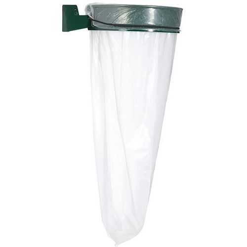 Jätesäkin kiinnitys helposti pannan avulla. Seinään kiinnitettävä säkkiteline kaikentyyppisille julkisille alueille: puistoihin, pihoille, pysäköintipaikoille ja tehtaiden uloskäyntien yhteyteen. Voidaan ankkuroida maahan pylvään avulla (tilattava erikseen).