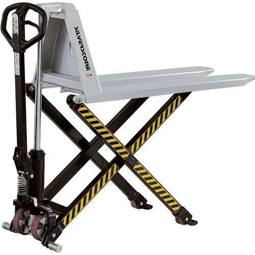 Manuaalinen saksinostovaunu 800 mm on varustettu polyuretaanipyörillä ja sitä on saatavilla eri haarukkapituuksilla.