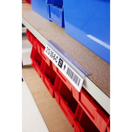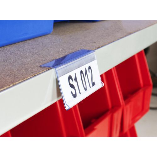 Itseliimautuva lipunpidike roikkuu vinossa hyllystä optimaalisen näkyvyyden varmistamiseksi, jolloin operaattorit tai asiakkaat voivat nähdä sen sisältämät tiedot selkeästi.