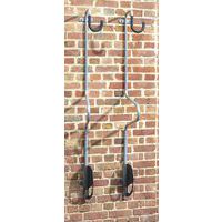 - Seinään kiinnitettävä polkupyöräteline, jossa muovipäällysteinen koukku suojaa etupyörää.