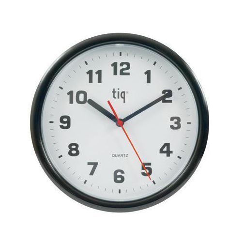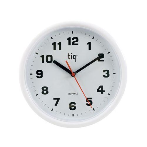 - Yksinkertainen seinäkello muovista, selkeät mustat numerot ja valkoinen kellotaulu.