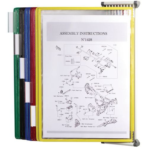 Tarpeiden mukaan muokattava teline tarjoaa rajattomasti mahdollisuuksia. Soveltuu hyvin kaikentyyppisiin tiloihin. Erivärisin luiskoin varustettujen otsakepidinten ansiosta asiakirjat on helppo järjestellä aiheittain. Mukana 10 A4-asiakirjataskua, 5 otsakepidintä (50 mm) liuskoineen (valkoisia ja värillisiä), 4 sivutukea ja kiinnitystarvikkeet.
