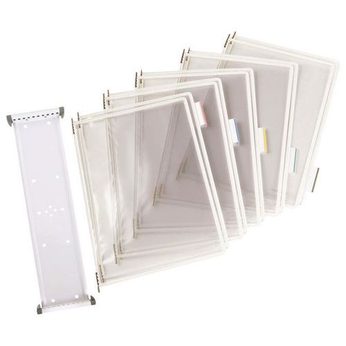 Tarpeiden mukaan muokattava teline tarjoaa rajattomasti mahdollisuuksia. Soveltuu hyvin kaikentyyppisiin tiloihin. Erivärisin luiskoin varustettujen otsakepidinten ansiosta asiakirjat on helppo järjestellä aiheittain. Mukana 10 A3-asiakirjataskua, 5 otsakepidintä (50 mm) liuskoineen (valkoisia ja värillisiä), 4 sivutukea ja kiinnitystarvikkeet. Valmistettu EU:ssa