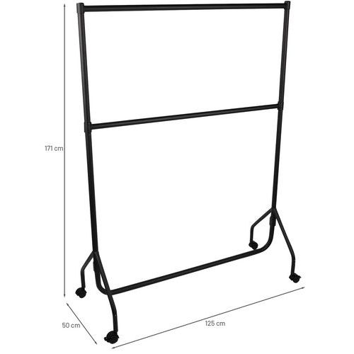 | Tavaranimike | Siirrettävä vaateteline, kaksi tankoa, Korkeus: 171 cm, Leveys: 50 cm, Väri: Musta, Tyyppi: Portant |