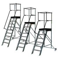 - Siirrettävä porras suojakehikolla, joka toimii turvallisena ja liikuteltavana työskentelyalustana sisäkäyttöön teollisuus- ja varastoympäristöissä.