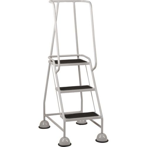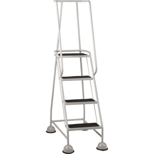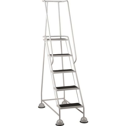 Vakaa ja helposti liikuteltava porras, valmistettu harmaaksi epoksimaalatusta teräksestä, tarjoaa kestävyyttä ja ammattimaisen ilmeen.