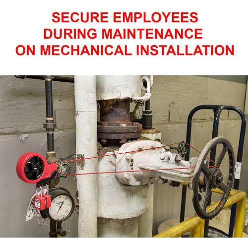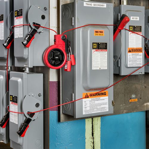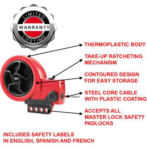 - Sisäänkelautuva lukituslaite kaapelilla Master Lockilta, ihanteellinen venttiileille ja muille lukitusjärjestelmille.