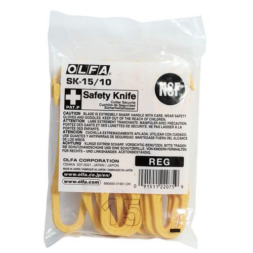 | Tavaranimike | SK15 turvaleikkuri, Sisäänvedettävä terä: ei, Väri: Keltainen, Keittiöön: kyllä, Runko, materiaali: ABS |