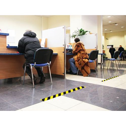 - Itseliimautuva lattiamerkintäteippi jonojen tai vastaanottoalueiden tehokkaampaan hallintaan.