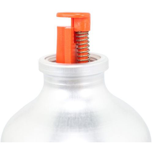 Turvapullo, jossa läppä, joka aukeaa vain sormella painettaessa.