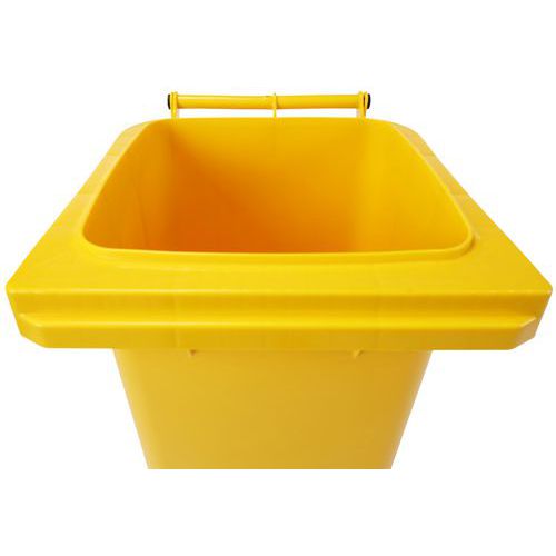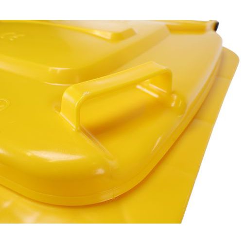 Käytännöllinen ja helposti käsiteltävä jätesäiliö vankkojen kahvojen ja pyörien ansiosta. Saatavilla useita värejä jätteiden lajittelun ja sisällön tunnistamisen helpottamiseksi. Kiinteät pyörät, halkaisija 200 mm. Valmistettu korkealaatuisesta korkeatiheyspolyeteenistä. UV-kestävä ja iskunkestävä. Säiliö, joka kestää kemikaaleja ja on suojattu haitallisilta hyönteisiltä. Ei ime nesteitä, pestävä ja steriloitava.