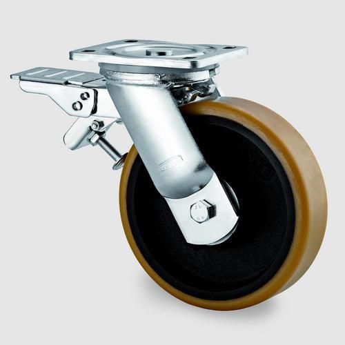- Kaksitoiminen jarru, joka lukitsee sekä pyörän että urakuulalaakerin. Käyttöalueet: Raskas materiaalinkäsittely.