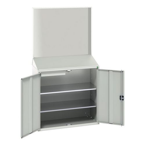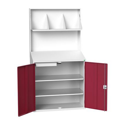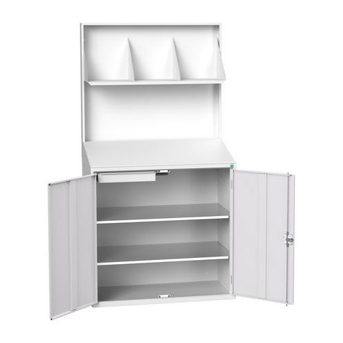 Konsultaatiopiste, jossa on takalevy ja korkea hylly. Kalteva kirjoitustaso. Alakaappi, jossa on kaksi galvanoitua teräshyllyä ja yksi laatikko. Vahvistetut pariovet ja integroidut kahvat. Lukittava.