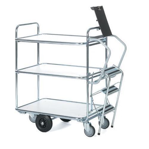 - Kevyesti kulkeva hyllyvaunu, jossa portaat, kirjoitusalusta ja kynäkotelo.