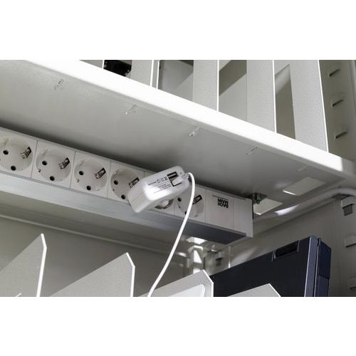 Kaapit on varustettu 240 V -pistorasioilla laitteiden lataamista varten, ja ne ovat maadoitettuja sekä CE-merkittyjä turvallista käyttöä varten.