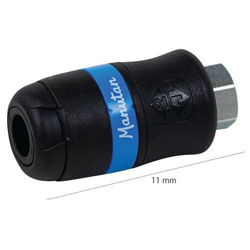 Turvapikaliitin. Automaattinen rengasliitin, jossa on korkealaatuinen koukkujärjestelmä. Kytkentä vaatii vain vähän vaivaa ja tarjoaa optimaalisen tiivistyksen. G-kierre tarjoaa erinomaista pitoa. Komposiittimateriaalista valmistettu runko on kevyt ja kestää hankausta, iskuja, murskausta ja tärinää. Suojaa herkkiä pintoja naarmuilta (runkomateriaalit, huonekalut jne.). Silikoniton. Kaikki Manutan-tuotteet ovat tiimiemme testaamia ja hyväksymiä. ISO 6150 B-profiili. Kappaleen Ø: 6 mm. Putken ulostulo: 8 mm. Debet: 833 l/min. Suurin paine: 16 baaria.