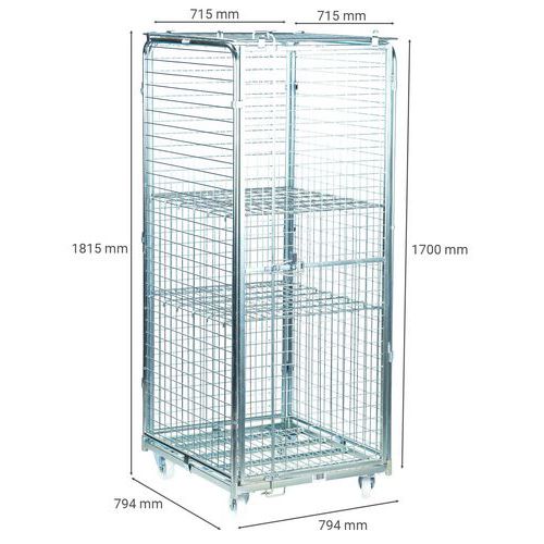 | Tavaranimike | Turvarullakko, kaksi hyllyä, kapasiteetti 400 kg, Kapasiteetti: 400 kg, Kokonaiskorkeus: 1815 mm |