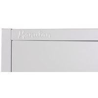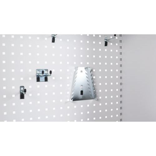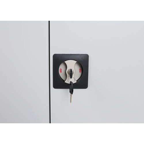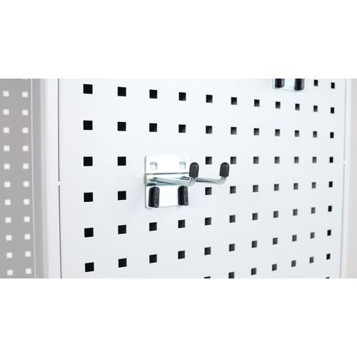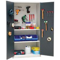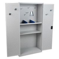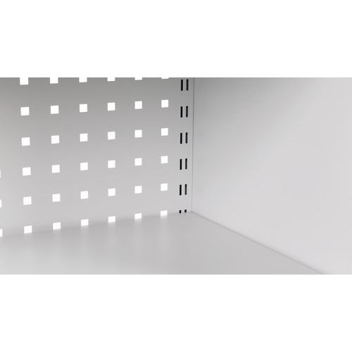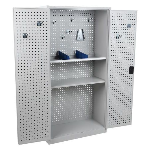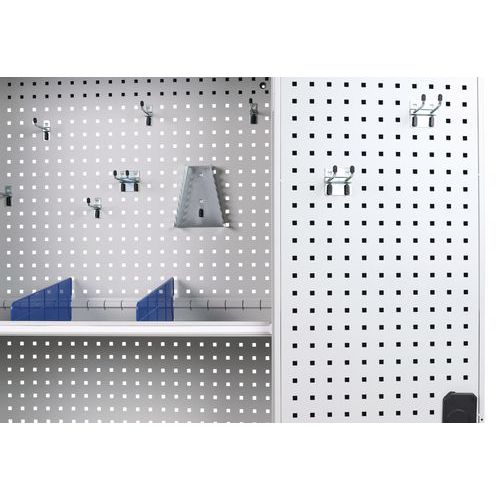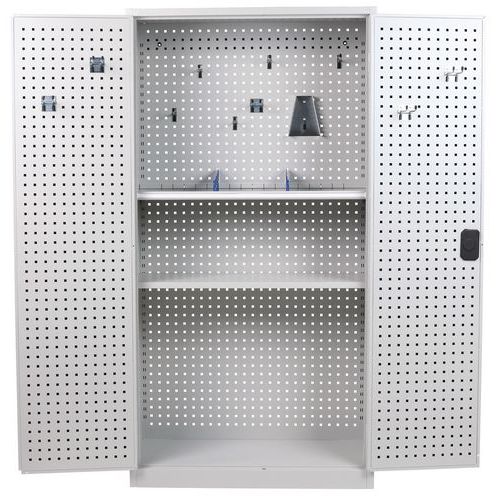 Takaseinä ja ovet reiälliset. Hyllytasoja voidaan siirtää 3,6 cm:n välein. Lukittavat ovet: 2-pistelukitus ja sylinterilukko. Kätevä säilytys 180° aukeavien ovien ansiosta. Toimitukseen sisältyy 1 sarja koukkuja, hyllyjä ja jakajia.