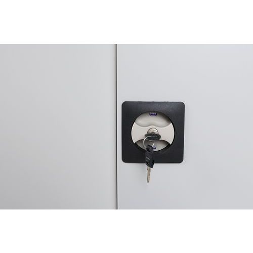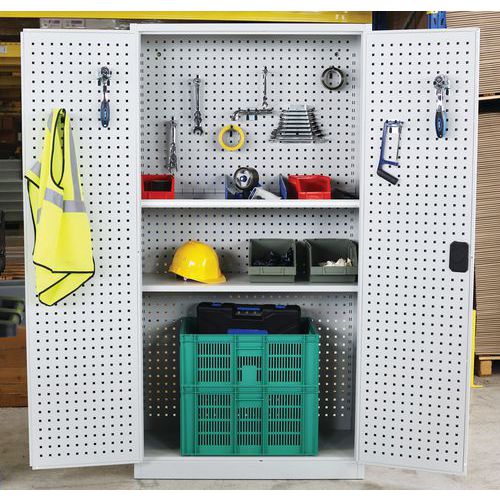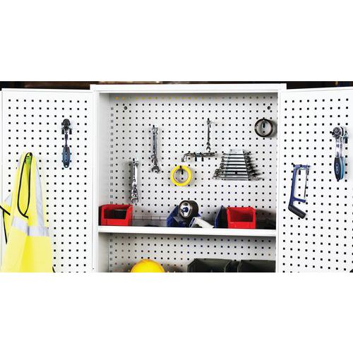 Takaseinä ja ovet reiälliset. Hyllytasoja voidaan siirtää 3,6 cm:n välein. Lukittavat ovet: 2-pistelukitus ja sylinterilukko. Kätevä säilytys 180° aukeavien ovien ansiosta. Toimitukseen sisältyy 1 sarja koukkuja, hyllyjä ja jakajia.