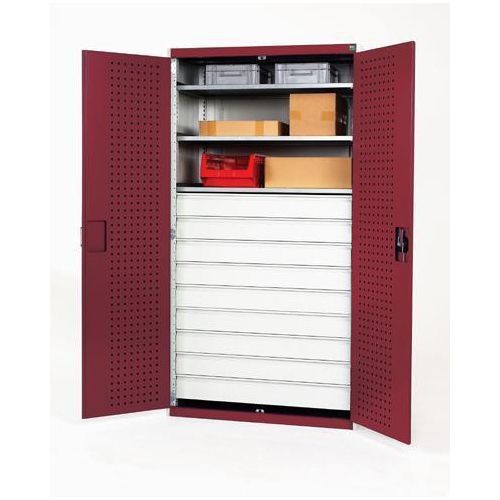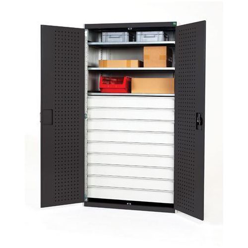 Erittäin vankka työkalukaappi. Kolme väriyhdistelmää. Valmiiksi sisustettu, eri yhdistelmiä. Sisäosat on asennettu valmiiksi kaappiin. Sisustus: 9 laatikkoa, korkeus 125 mm, kokonaan ulosvedettävät (100%), kapasiteetti 75 kg. 3 kiinteää hyllyä, kantokyky 100 kg. Ovissa reikälevy
