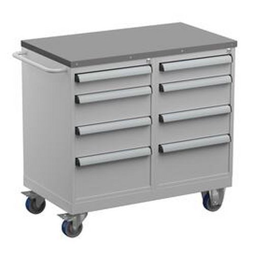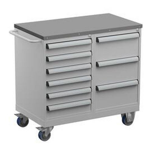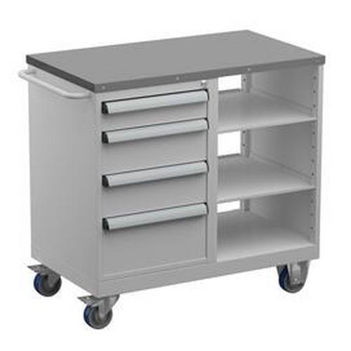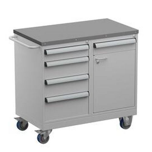 Työkalukärry 3 teräslevyllä on helposti siirrettävä ja kestävä säilytysratkaisu, jossa on erilaisia laatikko- ja oviratkaisuja, ja se on suunniteltu työkalujen ja laitteiden tehokkaaseen organisointiin. Kärryn leveys on 910 mm, syvyys 525 mm ja korkeus 880 mm, ja sen kokonaiskantavuus on jopa 300 kg, enimmäiskuorma per hylly on 50 kg. Jokaisen laatikon maksimikantavuus on 60 kg, ja laatikot avautuvat 100 % helpon pääsyn takaamiseksi. Epoksipinnoitetusta teräksestä valmistettu ja teräslevyllä varustettu kärry on sekä kestävä että käytännöllinen. Toimitetaan erikokoisilla laatikoilla (2x100 mm, 4x150 mm, 2x200 mm) ja on saatavilla vaaleanharmaana (RAL7035).