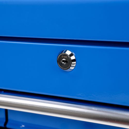 Lukitus työkalujen turvaamiseksi. Pehmustettu kantokahva molemmilla puolilla. Mukana 2 avainta. Pantone 300 C Blue color.