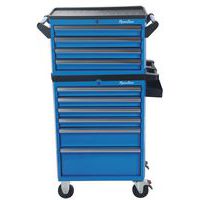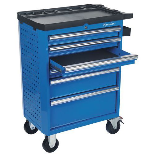 Sopii monentyyppisille työpaikoille. Laatikostossa on avautumisen estävä lukitus. Mallissa on 2 kiinteää ja 2 kääntyvää jarrullista pyörää. Reikälevyseinät lisäävät työkalujen säilytysmahdollisuuksia. Valmistettu sopimaan Manutanin vaahtomuovialustoille. Mukana 2 avainta. Pantone 300 C Blue color. Takuu (vuosia) : 10 vuotta