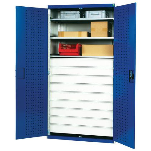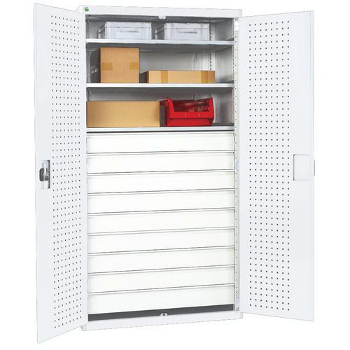 - Työpajalaatikosto työkalujen organisoituun säilytykseen. Paranna reiällisten ovien kapasiteettia reiällisillä tarvikkeilla. Hyllyjen korkeutta voidaan säätää helposti 25 mm:n välein. Ovet voidaan avata 180° ja ne lukitaan kolmipistelukituksella.