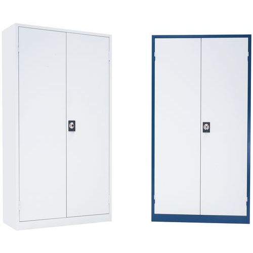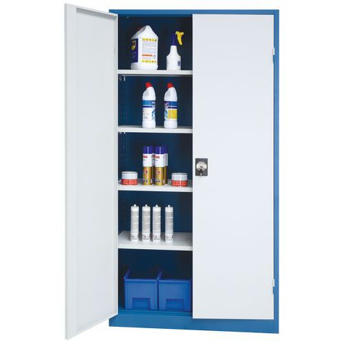 - Hitsatusta teräksestä valmistettu kaappi, jossa saranoidut ovet. Hyllyjen korkeutta voidaan säätää helposti 36 mm:n välein. Kaappi toimitetaan osina.