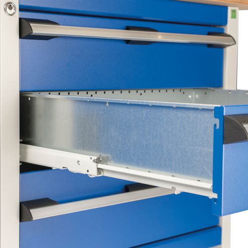Erittäin tukeva rakenne helpottaa lattian puhdistusta. Joissakin malleissa työskentely istuma-asennossa on mahdollista (polviväli). Tasaisesti jakautunut kuorma: 800 kg. Erittäin kestävät integroidut laatikostot. Laatikoston kuorma: 75 kg, laatikot täysin avattuna.