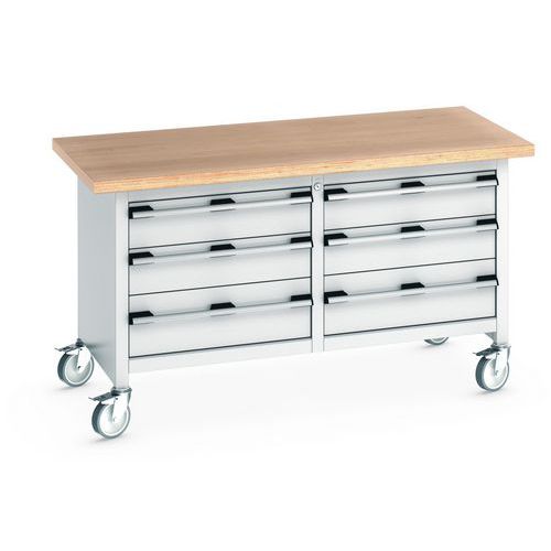Kompakti ja liikuteltava työpöytä tukevalla vaneritasolla. Pidä tavarasi turvassa lukitsemalla 6 laatikkoa keskuslukolla. Laatikot voidaan vetää ulos jopa 100 %. Työpöydässä on neljä kääntyvää kumipyörää (kaksi jarruilla).