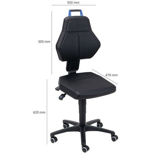 | Tavaranimike | Työtuoli, jalusta ja pyörät, Käsinoja: ei, Jalkatyyppi: Pyörät, Istuin, materiaali: Polyuretaani |