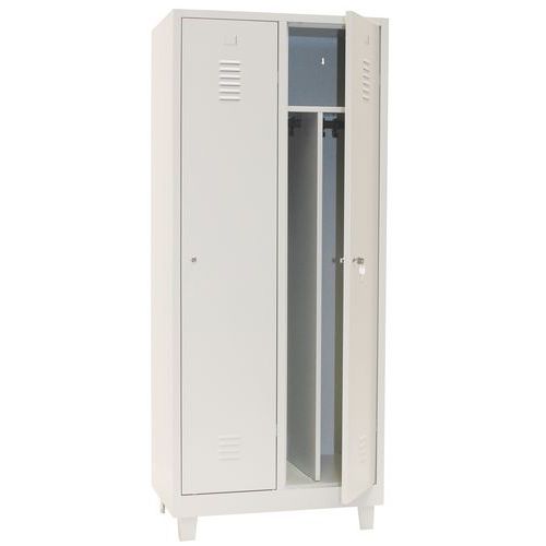 Ovet, jotka on vahvistettu näkymättömillä saranoilla. Optimaalinen avautuminen 180°. Hygieeninen: ilmanvaihto vaatekaapin ovien ylä- ja alaosassa. 1 erotteluseinä puhtaille ja likaisille vaatteille. 1 hylly, 1 tanko ja 2 koukkua per lokero, reiät seinäkiinnitystä varten ja etiketinpidike.