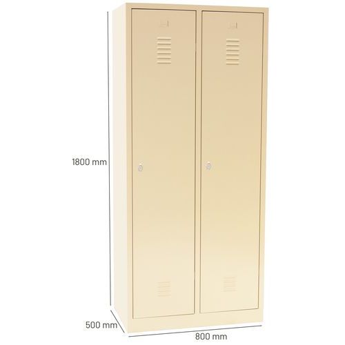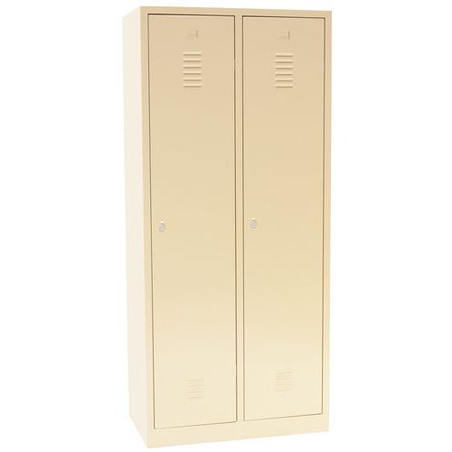 Ovet, jotka on vahvistettu näkymättömillä saranoilla. Optimaalinen avautuminen 180°. Hygieeninen: ilmanvaihto vaatekaapin ovien ylä- ja alaosassa. 1 erotteluseinä puhtaille ja likaisille vaatteille. 1 hylly, 1 tanko ja 2 koukkua per lokero, reiät seinäkiinnitystä varten ja etiketinpidike.