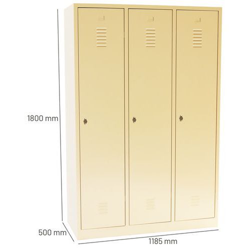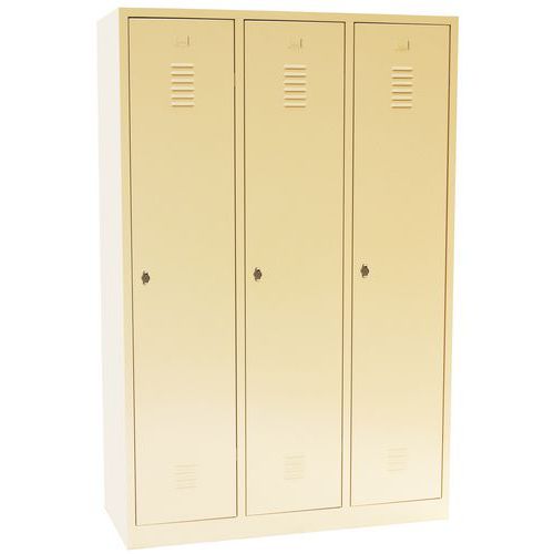 Ovet, jotka on vahvistettu näkymättömillä saranoilla. Optimaalinen avautuminen 180°. Hygieeninen: ilmanvaihto vaatekaapin ovien ylä- ja alaosassa. 1 erotteluseinä puhtaille ja likaisille vaatteille. 1 hylly, 1 tanko ja 2 koukkua per lokero, reiät seinäkiinnitystä varten ja etiketinpidike.