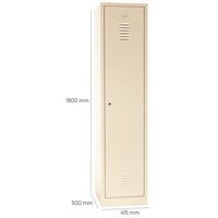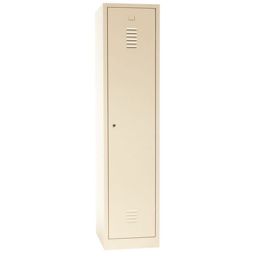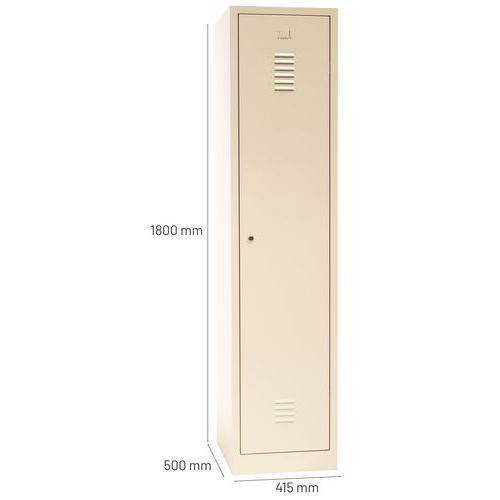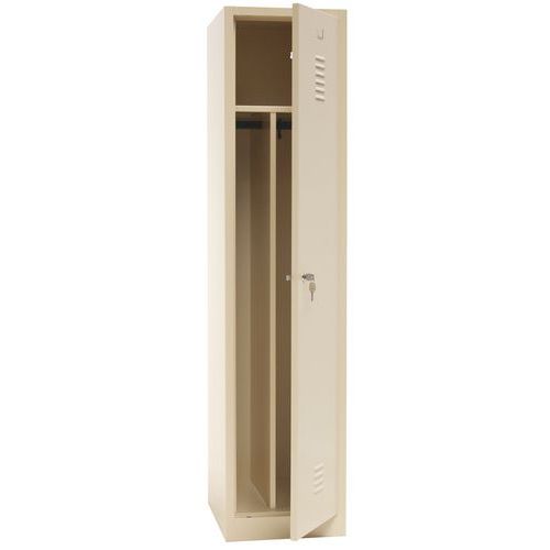 Ovet, jotka on vahvistettu näkymättömillä saranoilla. Optimaalinen avautuminen 180°. Hygieeninen: ilmanvaihto vaatekaapin ovien ylä- ja alaosassa. 1 erotteluseinä puhtaille ja likaisille vaatteille. 1 hylly, 1 tanko ja 2 koukkua per lokero, reiät seinäkiinnitystä varten ja etiketinpidike.